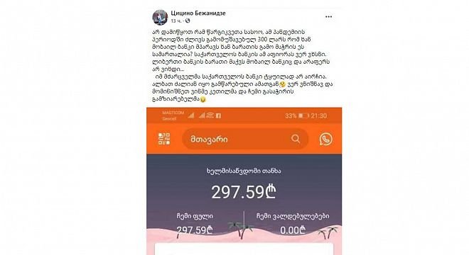 არ დამიწყოთ რამ წარგიკვეთა სასოო, ამ პანდემიის პერიოდში ძლივს გამომუშავებულ 300 ლარს რომ ხან მობაილ ბანკი მპარავს ხან ბარათის გამო მაჭრის ეს სამართალია? საქართველოს ბანკის ამ აფიორას ვერ ვხსნი. ლიბერთი ბანკის ბარათი მაქვს მობაილ ბანკიც და არაფერს არ ვიხდი...